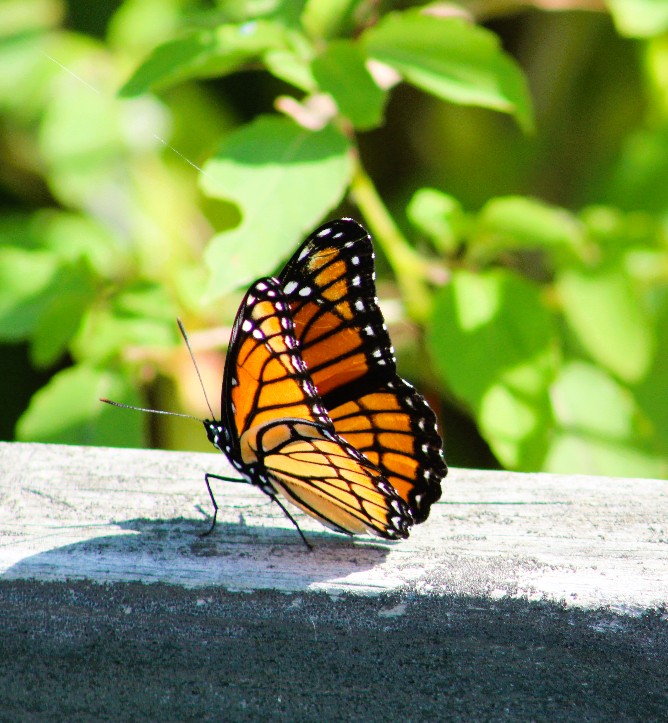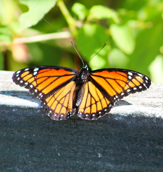 After taking a slew of shots, I was about to go down the slope to visit Luc when a flash of orange and black caught my eye, as it emerged out of nowhere, then fluttered down to the cement curb. No, it was not another Monarch, but instead a Viceroy, instantly identifiable by the black bars on its hindwings. There it sat, posing this way and that as if to say “take some pictures of me – I’m just as pretty as the other butterflies!”