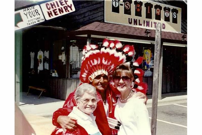 If this was a Jeopardy question, you’d answer: “what is a traditional Indian battle cry just before invading the enemy” … heck, this is something you probably did as a kid, running around in the backyard holding a feather to the back of your head, and moving your fingers back-and-forth over your mouth while yelling “woowoowoowoowoowoo” like a banshee. You didn’t do that? Oops! Well, I did it with my childhood friend Linda Crosby and we had a huge Indian-motif blanket strung up at a corner of the fence and draped into our respective yards which we used as our teepee. That has to be five decades ago for goodness sake. Several times this week WWJ mentioned a big celebration at Council Point Park in Lincoln Park commemorating the 250th anniversary of Chief Pontiac’s council which convened on April 27, 1763. (Yawn.) But, the WWJ story promised fanfare and a glimpse in history. The Lincoln Park Historical Society touted the week-long festivities on their website along with a history lesson. Since it is a stone’s throw away I decided this was my destination for today’s 2 ¾ mile promenade. The park itself stretches over many city blocks, has a nice footpath close to the creek’s edge and is just the perfect place to be on an absolutely fabulous Spring day. Now, while I wasn’t expecting to see an Indian brave riding bareback, hanging onto his pinto pony’s mane in one hand, and a tomahawk in another, a few Indian artifacts scattered about might have set the scene. A totem pole, a wigwam, some smoke signals perhaps? A tiny canvas teepee was the only evidence of any festivities and it was nestled between alot of R.V.s and Port-A-Potties. I half-expected a vendor pitching elephant ears, cotton candy and popcorn to be present as well. Lincoln Park’s version of City-organized festivities usually are disappointing. While I was never a cowboy-n-Indian movie fan, if I were to reach back in the ol’ memory bank, I can pull out a picture and fondly recall a 1992 trip to Cherokee, North Carolina made by my mom and me. We went the first week of May to Kentucky and North Carolina – the weather was perfect for sightseeing but it was so foggy and chilly the morning we planned to traverse the Great Smoky Mountains, that our waitress at the diner where we ate breakfast advised us to wait until afternoon to do the twists and turns on the winding roads to avoid hitting icy patches. To pass the time, we stopped in Cherokee, North Carolina at a small kitschy-type place called Teepee Village which was part of the Cherokee Indian Reservation at the entrance to the Great Smoky Mountains National Park. The little town’s chief attraction (if you’ll pardon the pun) was Chief Henry. A huge weathered sign proclaimed this elderly Chief to be the most-photographed Indian in the world. The Chief, who donned a traditional trailing headdress, beaded garb and fringed moccasins, charged a couple of bucks to have your picture standing next to him. It was soon evident Chief Henry liked the ladies and when he posed with them, he fairly preened as he gave a broad smile, a little wink and threw his arm around their shoulders. My mom and I also posed with the big man in front of the Teepee Village Strip Mall forever capturing a remembrance of that morning detour from our scenic Smoky Mountains adventure.