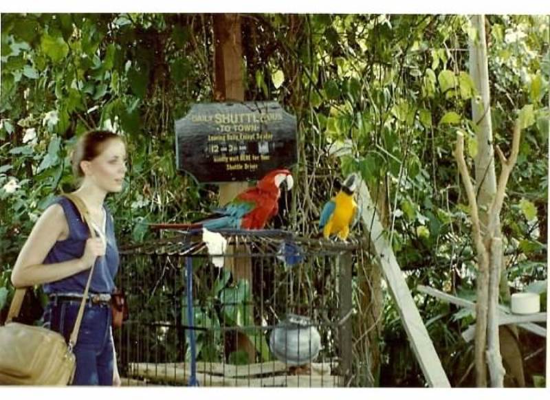 I’ve always had an affinity for my feathered friends, as you know from reaching this blog, and that includes parrots. As a kid, I’d stop on the way home from school, or ride my bike over to Feed Rite Pet Shop to giggle at the antics of the two Amazon Parrots that sat on huge perches behind the counter of the store. They were each chained by one ankle to a wooden cross-bar, and no one could get too close to them, due to their sharp beaks and claws, but it was great fun to listen to their squeaks and squawks and massive vocabulary. It goes without saying that when they imitated YOUR voice, you wanted to slip one into your bike basket and take it home. But parrots, delightful as they are, are kind of messy and more high maintenance than a parakeet or canary. Years ago, our neighbors became the proud pet parents of a lime green Parrotlet named Herkimer, after their daughter graduated college, and met her future husband, who unfortunately was allergic to feathers. Oops!! Herkimer was her dorm room pet all through college, but soon adapted to life at his grandparents’ home and was an equally delightful, though much-smaller version, of his counter-parts at Feed Rite. Somewhere in my albums and scrapbooks, there is a snapshot of me, taken at Florida’s Parrot Jungle, my arms outstretched, looking like I was about to take flight. I was laden down with parrots of every color in the rainbow. Their trainer was standing nearby in case the photo opportunity turned bad when a hungry parrot tried to take a bite of an ear or a nose. The picture above was taken in 1982 in Nassau, one of the ports of call on my Panama Canal cruise. This pair of parrots were the guardians of the gate at the park and they were just as delightful as my little buddies back at Feed Rite so many years ago.