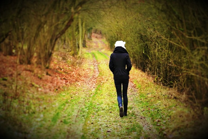 Today’s blog post was churning around in my brain yesterday and I originally intended to entitle it “Fitz-n–startz” because it seems to me that since I resumed my walking regimen, the marching ventures in this month of March have mostly resulted in fits and starts, nothing regular. There has been nothing much to write about during the past few trips – no interesting encounters, a rather lackluster landscape and plodding along with salt chunks crunching under the soles of my walking shoes, whether I am walking in the street or residential sidewalks. The sky most of the time has been dreary and cloudy, the remaining snow is rather dingy and the stringy-looking grass is starved for TLC in the form of fertilizer and sunshine because it sure looks brown and blah right now. Likewise, it is hard to have a spring in your step when you are pounding the pavement, in air temps of 11 degrees like when I stepped outside this morning. Perhaps I am just getting old, but it is hard to muster much enthusiasm for a walk when the wind is stinging your face and whipping through your bulky clothes from the tip of your head to your toes. But I’ve gone out most days anyway because there is no snow to slow my steps. There will never be 100% perfect conditions to walk every single day, and I guess I should reconcile myself to that fact if I want to consider myself an avid walker and perhaps strive to set a walking mileage goal again later this year. Thus, I really must get going in earnest before yard work rears its ugly head and puts a kibosh on the daily walk, plus soon I will be contending with the inevitable April showers. Now, I’ve never been that much of a free spirit that I’d be drawn outside to walk in the rain, let alone dance in it as that expression goes. Perhaps I am jaded by way too many years of commuting to work by public transportation and incurring the wrath of Mother Nature, i.e. slogging through a driving rain, or standing tapping my foot waiting on the bus in windy, drizzly conditions when an umbrella does nothing but turn inside out or try to go airborne. Thus, I am less inclined to venture out in inclement weather just to walk. Today is the birthday of poet Robert Frost who was born 140 years ago on this date. I put a little twist on the title of his famous poem below on my blog post today. With potential freezing rain predicted in the overnight, perhaps tomorrow morning the road for me will be a trip to the basement to pedal on the exercise bike and think of warmer, more-inviting days ahead. Perhaps another 100 days tacked onto today will yield such an inviting road less travelled as this girl above has chosen … peace, solitude and beauty all around. In the meantime, a girl can hope and dream can’t she?