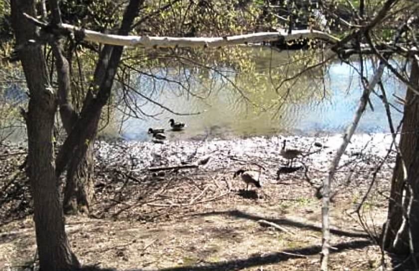I knew it was going to be a beautiful morning so I was up and out the door early since I planned a two-park agenda today. It was cold but the sun felt so good. My feet found the way to Council Point Park automatically and so I went exactly where they chose to take me. I was there on the trail before all the regular walkers, joggers and bikers and was enjoying my peace and solitude immensely as I walked along the perimeter path. I brought my bag of treats – more crumbed-up bread gleaned from my own loaf of bread and a fresh Ziploc bag of peanuts, but surprisingly the squirrels must have still been asleep high up in the trees because not a single furry friend came down to rush me and beg for nuts. Perhaps they all were ailing this morning, having gorged themselves on the overabundance of peanuts I threw their way yesterday. I glanced upward after hearing the motor of a small plane which interrupted my thoughts because it kept circling round and round and closer and closer to me as I was walking. The clear-as-a-bell blue sky was interrupted by contrails which crisscrossed in places looking like huge hashtags. This small plane appeared to be hopscotching across the sky in the marks made by its bigger counter-parts. At the Park, the trees are still bare and just now, the leaves are unfurling and opening up ever so slowly – in fact it seems everything in the Park is in a state of slow mo. My bag of treats was carried for naught since I saw no ducks or geese paddling down the creek today like I have in recent days. I am sharing this picture from last weekend of the ducks and geese I glimpsed as I peered through the saplings and brush at Lions Park. Though this morning’s walk may have been devoid of ducks and geese, I was regaled by a bevy of birdcalls which intensified as I walked along. Sweet tweets, warbles and chirps were abundant as the birds babbled back and forth to each other in a language only they could understand. I interjected a whistle here and there as an interlude to their “music” and today they simply ignored me … of course, they knew I was not “one of them” so I finally quit trying. I did my Park loop and at the tail end, I heard some splashing noises in the Ecorse Creek. I figured it was a goose, or perhaps that trumpet swan or heron had come back so I quickly went over closer to get a look. I saw a man in waders walking down the middle of the creek and carrying what looked like a pool-scooping net. Every so often he dunked his handled net into the water, drew it out and examined the contents. He was making alot of splashing noises in the process. I couldn’t imagine that he’d be fishing there and he was intent on his job so I didn’t want to bother him to ask. But, my curiosity got the better of me when I saw two women unloading cleaning supplies from a van with a Wayne County emblem on each door, then washing off the half-dozen picnic tables under the pavilion cover. I walked over to one of the women and we visited a little about the weather, then I asked if Wayne County was now taking care of the Park. The women told me that the County participates in nature projects with all the large parks where there is a body of water nearby. The County workers collect samples of the water from the creek, then pour the water and its sediment – critters or otherwise – into receptacles that resemble egg cartons and local elementary students can analyze the grubs and bugs and pick them up using plastic spoons. Right after she finished her explanation, she pointed at a group of youngsters walking along single file across the Park and she told me that they were kids from nearby Keppen School. A walkable field trip! I thanked her for the info and hurried to part two of my agenda – Lions Park. The trip was scenic but unlike my find a few days ago, there was no sign of life at this Park either. I was determined to discover a goose or two sitting on eggs and the eventual chance to get a gander at a some goslings come hatching time. Perhaps this whole miracle of life is similarly in slow motion just like everything else seems to be as this chilly Spring languishes through this first week of May.