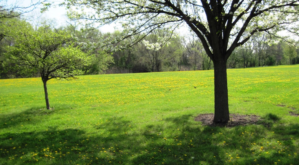 A week between visits to Council Point Park was simply too long for me. The weather took its toll on my walking regimen so I had to be content with a few short hops and staying put the rest of the time. In the week while I was away from the Park, all the trees came out – nearly every tree was adorned in either brilliant green leaves or in beautiful blossoms. The vast grounds were similarly adorned … with dandelions that is. They were everywhere and some places it was hard to see the grass for the golden yellow heads dotting the landscape as you see in the picture above. I had on a dark coat and when I arrived home, as I hung my coat on the hall tree, I saw the shoulders and sleeves were covered with yellow pollen. Allergists had predicted the Polar Vortex events would cause everything to leaf out or bloom at once thus causing a disastrous double whammy for people with Spring allergies. I am in that category. Today’s dusting of pollen on my clothes and a two-loop trip around the Park made me a sitting duck for a series of sneezes soon after I arrived home. I just figured I was mellow yellow after venturing out – mellow from a trip to my favorite go-to spot and yellow from pollen flying through the air, so why not entitle my post as such? I do wish I’d not thought of that silly old Donovan song though, as it’s been an earworm the rest of my day.