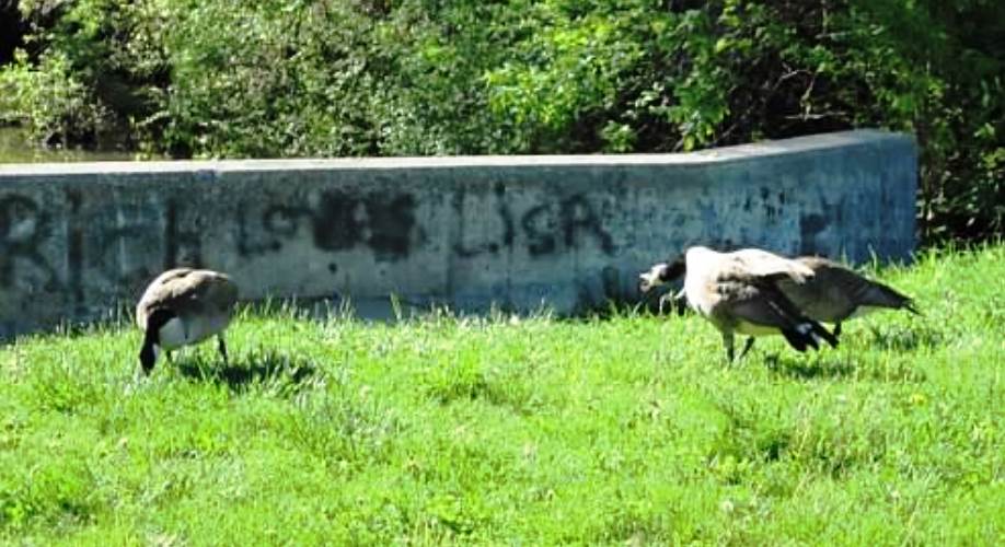 While I enjoyed watching the Canada Goose family who clustered around me enjoying the morning treat I had provided for them, and, just as I reached into the bag for a third scoop to toss out, a couple of geese that had been grazing nearby, came waddling over to get a piece of the action. Within minutes there was much honking and carrying on. I tossed out more tidbits and the latecomers were eager to partake in the goodies, except one was so anxious for a treat that he stepped forward and cut the other off at the pass. Thereafter, much raucous honking ensued from the wayward pair, and one goose, clearly annoyed, starting hissing and sticking its dark-pink tongue out while flapping its huge wings in an effort to chase the other goose off. Such atrocious table manners! But all that huffing and puffing didn’t stop his counter-part from contentedly nibbling on the bread, so the rabble-rouser tried a different tactic … putting his head down low, and running as fast as he could on wide-webbed feet, he next started ramming his beak into the side of the other goose! I was amazed, and a little horrified, to have witnessed this “goosing” incident with me standing right there, so I quickly spread the rest of the bread and got the heck out of Dodge before I was the next target! It was only later, when I uploaded this photo, did I see that gorgeous graffiti in the background lending a little humor to the fractious pair … well, boo-hiss back at ya!