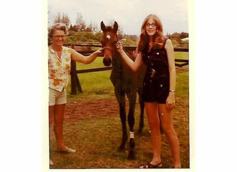 Back in 1972 I was lucky enough to pose with this pretty chestnut foal that belonged to friends of our family in Coral Gables, Florida. This colt was stabled with a racehorse Alex and Betty Kantor owned and ran at Hialeah Park Race Track back in the late 60s and early 70s. My parents and I were visiting them for a few days before taking a Bahama Islands cruise out of the port of Miami. We saw the usual tourist attractions, including the greyhound races at Hialeah Park. One day they took us to the horse farm. Immediately I fell in love with this foal and did not want to leave her at the end of our visit. She was all sweetness and goodness and followed me around the paddock like a puppy. Her shiny coat was warm from frolicking in the Summer sun and her velvety ears and soft mane endeared her to me as she nuzzled up close. What little kid didn’t want a pony growing up? Well, I did, and then, after our visit, I now coveted a horse, just like this one. Perhaps I was channeling Liz Taylor’s character “Velvet Brown” in “National Velvet” … who knows? But a horse was not in the cards for me. I wish I remembered this sweet foal’s name … perhaps her moniker contained the word “star” for obvious reasons. I know she was a star in my mind anyway and I hope California Chrome will similarly be a shining star by day’s end.