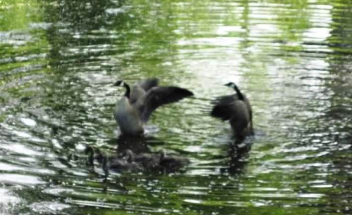 I decided another trip to Wyandotte was in order on this especially muggy morn. I had intended to walk down to the railroad tracks then head back because that is the same amount of walking steps as a roundtrip to Council Point Park with one loop … it is 7,000 steps or 3½ miles. But, I left later than usual since I was downstairs washing and drying a heavy woolen blanket which took forever to finish up in the dryer. I figured it was finally Summer and safe to swap the heavy blanket for a lighter one, even though we have officially passed the Summer Solstice and are now headed toward Fall and Winter. What a pessimist I am sometimes! Well, it was warm and I really didn’t want to hurry so I moseyed along on Emmons Boulevard, re-tooling my intended itinerary in my head while I walked, and eventually deciding just to wing it. When I arrived at the bridge that separates Wyandotte and Lincoln Park, and while crossing over the Ecorse Creek, I peered into the water, as I usually do, scanning for a sign of life. It is still a mystery at this venue, just like at “Duck Landing” at Council Point Park, exactly where the waterfowl disappeared to. When I began my walking regimen in the Fall of 2011, this bridge was my favorite go-to destination, partly because the small Creek area was filled with geese and ducks. I always took some bread with me and that Winter of 2011-12 was so mild, I was able to make this 2¼-mile foray on a near-daily basis. So, it was a quick glance to the water, then a double-take … well, I thought my eyes were playing tricks on me because tucked near a tree was a small alcove and the dappled water was churning from geese and ducks and their respective broods who were all congregating there. Where did they come from? The geese and ducks used to swim in the Creek and mill about on the grassy banks and backyard of a nearby residence before a huge berm was built last year … then all the geese and ducks disappeared and I’ve not seen them since. I stood on the bridge looking over at the geese, yet I don’t think they could see me as they continued eating, drinking or grooming themselves. There were several pair of geese with the goslings clustered around their respective parents. The goslings are so much bigger than the last time I saw them, even though I could only see the upper part of their body, which was not submerged in the water. Their plumage has darkened substantially and their markings now more closely resemble that of the adults. They were noisy as well, with the occasional half-hearted honk being heard. I watched them follow the lead of their mothers as to what reeds to nibble on, where to dunk their head and dive into the water, and even the basics, like a quick primer on how to preen their feathers. It was both cute and comical to watch how quickly the goslings mimicked what the mother goose did, even if it was accomplished somewhat clumsily. Interestingly, a few small birds swooped down on a pair of geese attending to their youngsters, and the pair quickly reacted by raising out of the water and much hissing and wing flapping ensued. The goslings just took it in stride and stuck close to their folks and those smaller birds took off in a heartbeat. There were several mallards – both males and females. One mother duck kept her offspring in check in a neat row behind her, so now I really understand where the expression “getting all your ducks in a row” originates. The female mallard had six ducklings who followed closely on her tail; if she swam to the left, so did they and it appeared no one dared get out of place. They reminded me of a wooden pull toy I had as a young child … the larger duck and then a string of smaller ducks followed behind; all had tiny wheels and a thin wire tethered them together so they always stayed neatly in a row. Well, this whole scene just warmed my heart and I vowed to return and bring bread in case there is some secret hidey-hole where they congregate or live nearby now. This is by no means the entire group of mallards that I used to see at “Duck Landing”, but perhaps part of that group “migrated” from there to here. I’ll share some more pictures of this idyllic setting down the road, but this one was my favorite – the pair of Canada Geese, their offspring in tow, chasing off the small songbirds that swooped down too close to their little brood.