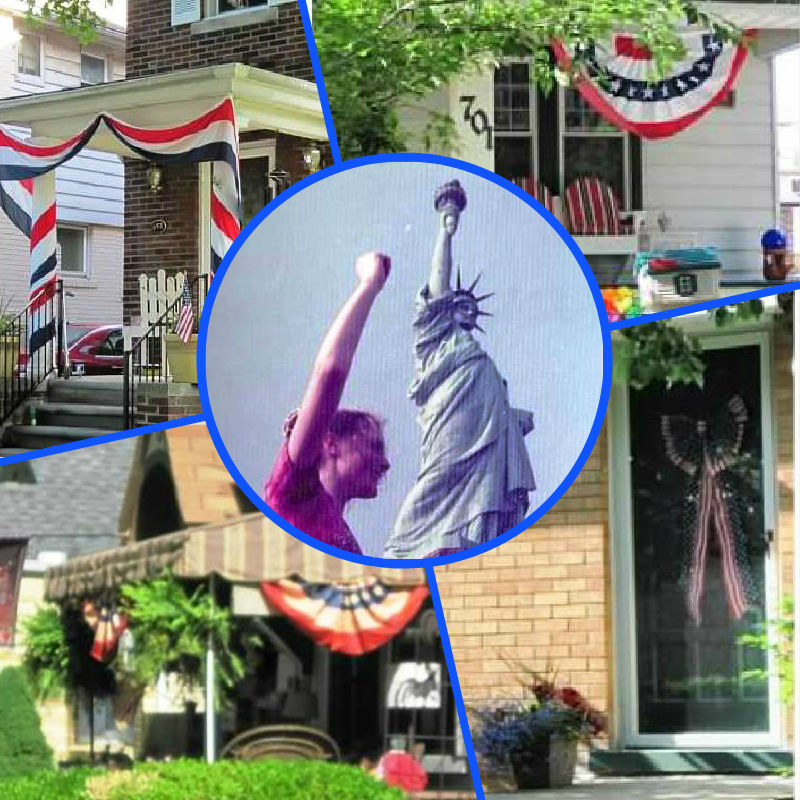 On this Independence Day, there were many homeowners proudly flying Old Glory, or the front of their homes were abundant with bunting. I photographed about ten of the homes and these four were my favorites. For a little fun for “Flashback Friday”, I’ve included a picture of myself in the inset of this collage. The photo was taken in 1975 when I visited the Statue of Liberty during Easter Break from Henry Ford Community College. Five other HFCC students and I were participating in the National Model United Nations Conference at the Statler Hilton Hotel in New York City. It was a week-long event and we had afternoons and evenings free. Our HFCC group spent an uncharacteristically hot-for-April afternoon visiting Liberty Island. I remember climbing up the very narrow staircase, all the way to the crown, in the sweltering heat, almost feeling like I would pass out. It was worth it though and the vantage point gave us an unforgettable panoramic view of the harbor. I do believe Lady Liberty struck a better pose than me however.