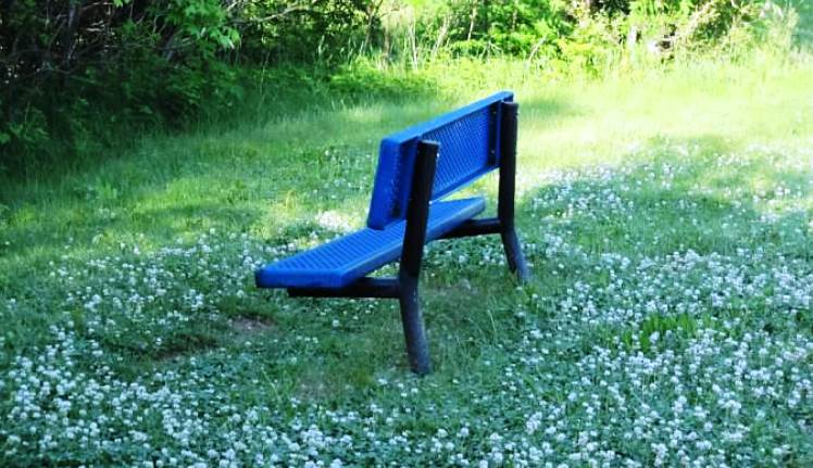 It was a beautiful day in the neighborhood and beyond. When I left the house early this morning, there was just a whisper of a breeze and it was very quiet in the various neighborhoods as I made my way to Council Point Park. Once again, homeowners slept with A/C units turned off and enjoyed the cool air coming through windows and screen doors. The Park was more abuzz with activity today and alot of people were on the perimeter path, mostly walkers, a few moms pushing strollers and a rollerblader. I heard that elusive frog burping again, but soon his loud croaking noises were obliterated by the Wyandotte train sounding its whistle as it neared Emmons Boulevard. There was clover everywhere, and in some places it was so overgrown, all you could see were bobbing bunny heads as they savored the sweet treat. I concluded that the rabbits had been busy this Spring as there were a plethora of baby bunnies, all contentedly munching clover until some big ol’ human came along and then they bounced off for parts unknown. This bench above is one of many blue benches scattered around the edge of the Park. This particular one is situated fairly close to the banks of the Creek, and, as you see above, currently it is sitting amidst an area of white clover. This park bench might seem to be calling out “come over, come over and sit in the clover” yet it didn’t beckon me to stop and break my stride. You see, the bench seat is rather sloped, giving one the illusion that if you plunked down on it, you might slide right off and onto the grass and roll down the bank … it’s best to just carry on. This morning, the water was completely calm, and since it was rain-free yesterday I ambled down along the Creek banks and peered through the reeds, hoping to catch sight of something interesting, maybe that big bullfrog. For my efforts, I saw some bubbles on the top of the water which I studied for a few minutes wondering if they were fish lips nibbling at bugs on the surface, or a frog coming up for air, but nothing materialized. I also saw the mother mallard with her ducklings in tow, paddling along in between the reeds on the opposite side of the Creek. There was no use trying to take a picture of those sweet little ducklings dabbling in the murky water, because the rather drab, ochre-colored feathers of the female and similar mottled plumage on her brood, made them all blend right into the muddy-looking Creek water and boring backdrop of bulrushes. The Park was alive with tweets and twitters from various songbirds and it was so very tranquil to walk amongst them. A red-winged blackbird, high above me in a tall tree, was singing his heart out. They were long, strong sounds which often threatened to drown out the trills of the smaller songbirds. There are many red-winged blackbirds in the tall trees which line the Creek, and they are easy to identify with their glossy black bodies and pretty patches of red and yellow on both wings. As I walked past the tall tree, one of them swooped down close and landed ahead of me where some kindly soul (not me this time) had shared their black-and-white-striped sunflower seeds on the path, and he seized the opportunity to feast on them. He was enjoying this unexpected treat and was so fearless, that I was almost on top of him before he flew away. The songbirds in the Park produce a constant melody, especially delightful on a still morn, and I like responding to them by returning a whistle or two – their singing is so infectious that sometimes I just can’t help myself. I believe that if the birds in the Park were on Twitter, they would all have been tweeting out this trending topic: #anotherbeautifulday. Reluctantly, after two complete laps around Council Point Park, I started for home and as I was walking up my sidewalk, I was still chuckling over the thought of birds using social media to tweet to one another, rather than merely warbling. Then, out of the corner of my eye, I spotted a plump baby robin in my garden alongside the house. I hurried over to get a better look, and saw that he was a resin robin with a mischievous smile on his face. I knew instantly that my neighbor Marge had gotten him for me and stood him amongst the mulch and the potted silk flowers to make my day … which it did!