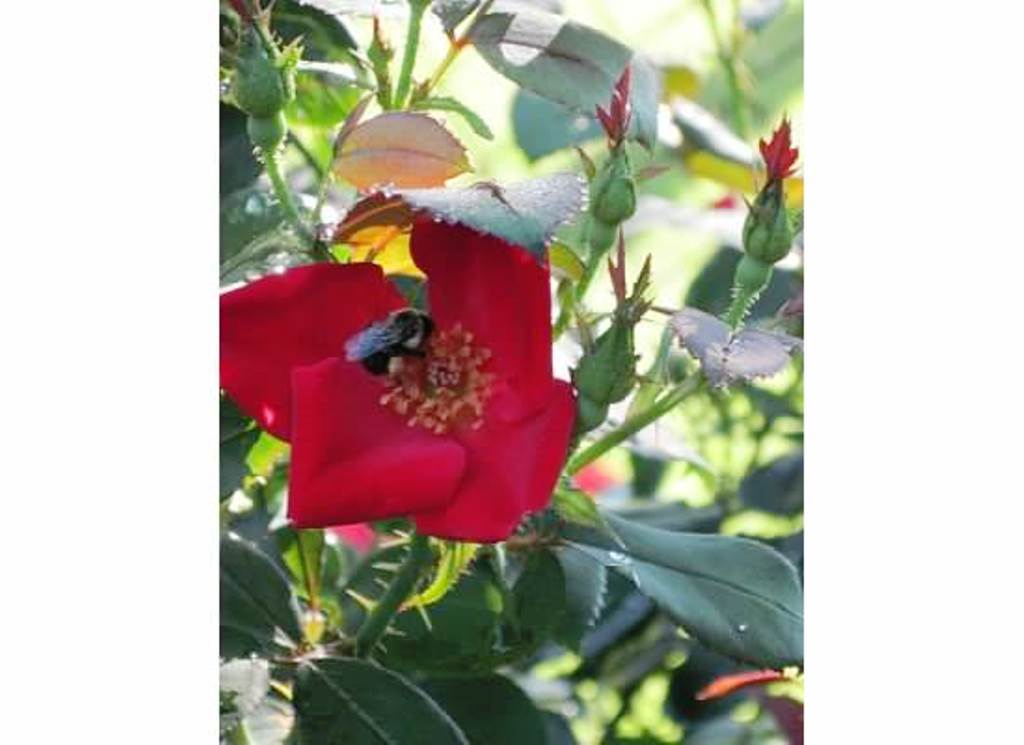 Once home, I removed the pedometer and noted I had chocked up a quick 3 ½ miles, then I switched to my comfortable old loafers and headed outside. Whew, it was hot now. I dragged out my push mower and did a hasty job on the front and back yards, then went into the backyard to scrutinize the weeds to see if they needed my attention. I was happy to see I had held those prickly thistles and creeping and winding buggers at bay, so I just had to nip my roses. The bees were all over the yard, busily sucking down the nectar from the coneflowers and the roses along the fence. They were burrowing down deep and very involved with their mission, so I waited a bit, went back in the house for the camera, took a picture, returned to the house, and back out in yard where they were still there. Finally, rather impatiently I had to shoo them away with my pruning shears, so I could tackle the roses. In case you’re wondering, yes, these are the same Knock Out Roses which at Mother’s Day I thought had given up the ghost. These rosebushes have rallied back and are full of blooms, the end result of cutting them down to mere stubs, alot of organic rose fertilizer and crossed fingers. Hmmmmm – maybe I do have a green thumb after all. Speaking of digits, I never work in the yard without heavy gloves as I am so terrified of bugs. Somehow, while pruning the spent rose blossoms, a wayward thorn pierced through my heavy leather glove and stabbed me on my right ring finger. I yelped immediately, then, because I was annoyed, I yanked off my glove to pluck it out, but it was already embedded deep into the pad of that finger. I figured I would deal with it once inside the house, but standing under a bright light, I saw the thorn was lodged so far down I had to perform minor surgery. A sterilized safety pin, a quick rinse in alcohol and a band aid to pad the big wound and I was good to go. Or, so I thought. I favored that finger, trying not to bang the boo boo, while I did a few things in the kitchen, then sat down at the computer. Ouch! Well, good thing it is the weekend, so no pounding the keys for a few days … I still got this blog post done, even though I tried to refrain from using the letters “o”, “l” and the numeral “0”. Well, if I was going to sustain a casualty from the backyard, I sure am glad I messed up a finger that gets very little action on the keyboard!