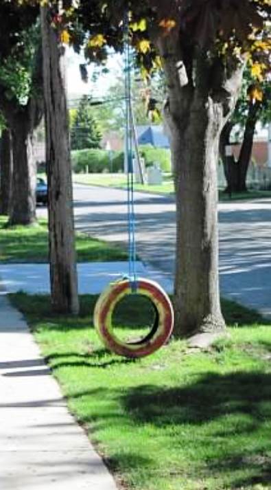 Another stellar weather day and I wish I could have gotten in a couple of laps down at Council Point Park, but I had to divvy up my allotted walking time with a trip to the dentist. Well, I had no cavities or issues and I got in about 2 ½ miles anyway, just by walking around the neighborhood before I made the roundtrip to the dentist, so I am not a complete slacker . I took a rather convoluted trek to get there, and, in doing so, I strolled up a few streets where I seldom visit. In the still of the early morn, I heard the creaking sound of a porch glider continuously rocking back and forth, and the harsh, shrill and screechy noise sounded almost like chalk on a chalkboard and went right up my spine. It was an incessant grating noise of metal-on-metal, and, as I got closer, I wondered if the neighbors have ever offered up a can of WD-40 to quell that creakkkkkkkkkkking noise. As I passed the elderly couple, sitting side-by-side , I noticed the gentleman was in charge of “rocking” the glider … I thought that was chivalrous of him, then I realized the woman must have been very short as her feet, still clad in fuzzy mules, were far from reaching the ground. I smiled and mouthed “good morning” and they waved back, then I continued walking along, until finally the glider noise abated when I was far enough away. A few minutes later, I spied this tire swing hanging from a fairly small tree and had to chuckle because it might have “worked” for the elderly, short lady or a very small child, as it was hanging pretty close to the ground. If I had tried it out, once I plunked down, I’m sure I’d never have gotten up again unassisted. The swing looked well-worn as the paint had started to peel off the tire which had been painted yellow and brown and looked kind of like a big skinny donut.