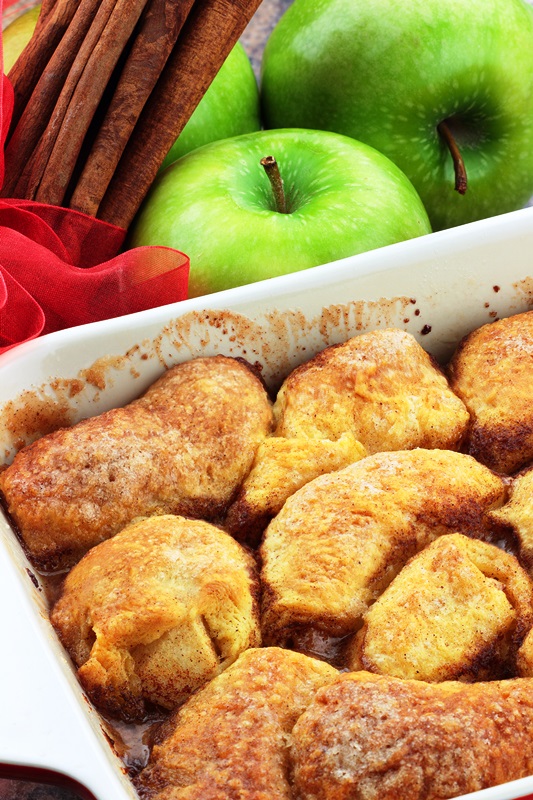 Before I set out this morning. I finally succumbed to the “feelin’ Fallish” weather and decided to wear my sweat suit … and, I sure was glad I did. I had some errands to do along Fort Street and when I passed the marquis at Memorial Park, it said 50 degrees. Well, brrr. The warm sun made it tolerable though. I glanced across the street at the Dairy Queen’s sign that proclaimed “pumpkin pie treats are back”, which probably would have beckoned more customers if they didn’t have to suck down a Pumpkin Pie Blizzard while holding the cup with gloved hands. As I passed the gas station, there was the usual morning hustle and bustle as customers fueled up their cars, then themselves on hot beverages. There was a queue to get in the door and each person came out with fingers clasped around a paper cup with steam wafting from the top. I think Mother Nature has hoodwinked us into believing it is still Summertime. My last stop was at Walgreens where I rolled up my sleeve to get my annual flu shot. Along with those SweeTango apples I’ve been eating, hopefully I’ll keep the germs at bay. I love those “sweeties” as they are sometimes referred to – lots of crunch, very sweet and perhaps I am just enamored by the name “sweeties” as well. Well, if the latter is the case, perhaps a hot apple dumpling should be the treat for the day instead of a cold apple and a chunk of cheddar. It is, after all, National Apple Dumpling Day, and who doesn’t think that a hot apple dumpling minus ice cream would warm their innards and put a smile on their face right about now?