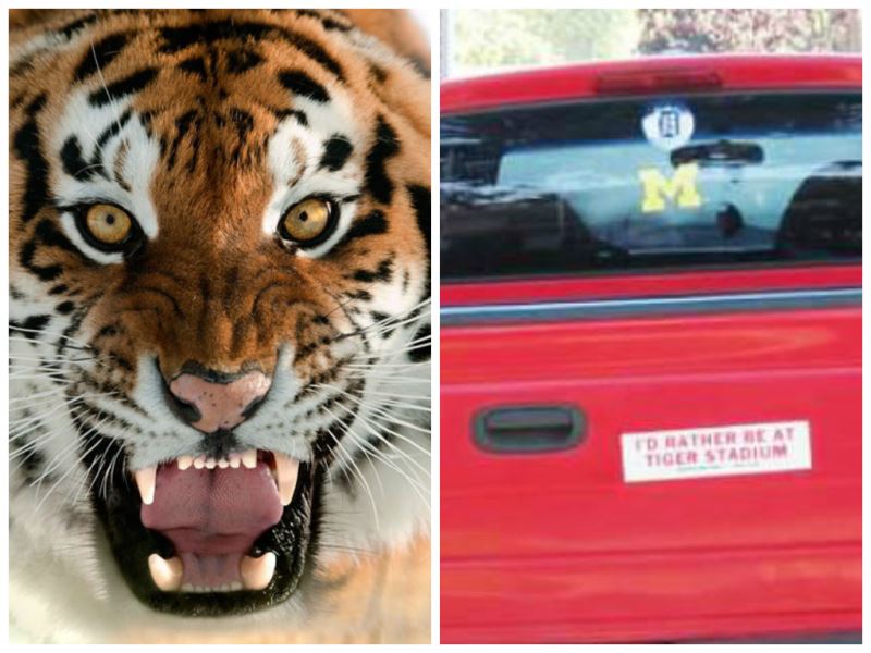The fog came on little cat feet once again this early morning. I always loved that poem by Carl Sandburg. Here in Lincoln Park, there wasn’t as much pea soup as the other ‘burbs – it was just mighty misty. In thinking about that poem, I could not help but make an analogy to one of our favorite feline teams – the Detroit Tigers, who will begin wending their way through the playoffs today hoping to attain the ultimate catnip – er, prize … winning the World Series. Will they be clawing and scratching all the way? Will it be the Year of the Cat? It’s hard to predict right now, isn’t it? I saw this bumper sticker at the rear of a bright red pick-up truck. A wistful and forever fan who no doubt will be holding onto the dream as long as possible.