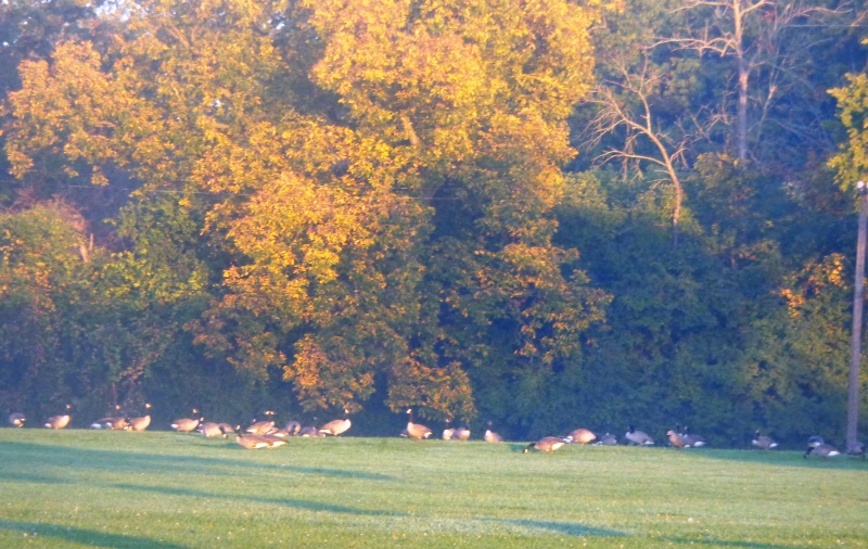 Another damp and dreary day – wherever does all this rain come from? But, while we Michiganders bemoan day after day of rain, in Montecito, California the drought has languished so long that the City has cut the allotment of water use by some 90%. It is so bad that some owners of pricey real estate have their water brought in by the truckload, at a whopping price of around $600.00 a tankful. Seems incredulous doesn’t it? So, while we’ll never get the prolonged California heat, nor suffer similar drought-like conditions, hearing of their plight somehow makes the endless rainy and dreary days just a tad easier to take. That said, the morning was not really conducive for walking and I was a little bummed as my boss was out most of the day today, so I had a little extra free time. My friend and neighbor Marge was headed to Elizabeth Park, camera in hand, undaunted by the dreary day, and she asked me to tag along, so away we went for a sojourn to the sticks at beautiful Elizabeth Park in Trenton. During the drive around, it was a feast for the eyes. The Park’s many trees were all so picturesque since Mother Nature’s paintbrush took some swipes and dabs at a plethora of their foliage, making them look like living stained glass. Mostly we saw ducks and geese. Well, as the saying goes … “it is weather for ducks”. Finally, a few slivers of sun shot through the clouds and brightened up the morning sky, and soon a gaggle of geese seemed eager to greet us. Maybe they thought they had the place to themselves today due to the inclement weather and were taken aback when we entered their personal space. At least they were photogenic, and not feisty!