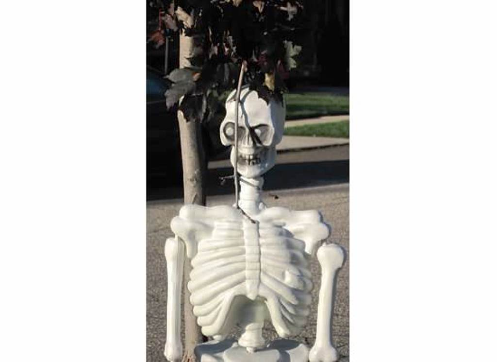 … it was bone-chilling this morning but I managed to eke out a walk, albeit small, just in the neighborhood, to pile on a couple of more miles toward the big goal. I toyed with the idea of sleeping in instead, which sounded mighty fine while I was curled up so cozy when the alarm went off, but decided not be a lazybones and get out there and walk. Last year I was kicking myself at year end for those last two weeks in October when I deemed it too dark in the early a.m., and not worth my while getting suited up and out the door for a mere two miles. Bonehead, that I was back then, I stayed inside instead; then, at the end of the year I was wishing I had those measly miles and did not have to traipse in Memorial Park in the snow, ‘round and ‘round like a draft horse stomping out the required miles to meet my goal. This morning, it took forever to get light outside, however, and I just did a couple of laps around Ford Park since it was too late to head down to Council Point Park; I’ll reserve that outing for the weekend and next week after Daylight Saving Time ends. Nothing spooky this morning … it’s crunch time as leaves were falling and fluttering all around me as we get ready to close out October and speed toward November. The leaves were still intact on this mini King Crimson Maple from where I found Mr. Skeleton hanging from a branch, his bones wiggling and rattling in the slight breeze. He looked kinda cold – they could have at least given him a muffler and mitts to keep him warm.
