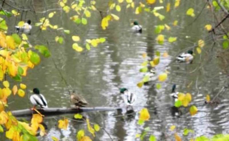 When I arrived at the Park, I was the first one there, and that surprised me since the wind was not huffing and puffing and there was no precipitation (for a change). The red-hued leaves have now disappeared, and, in their stead there are yellow leaves aplenty. The term “harvest gold” sure was the color of the day as golden leaves littered the Park and were drifting in the swift Creek current as well, in fact – it made the water look almost golden in some spots. As I walked my two complete loops around the Park I heard the brittle brown leaves hanging on for dear life and wiggling in the wind, their crispness sounding like mini chandeliers in the slight breeze. The Park’s formerly vibrant colors are now mostly mottled and muted now, and almost non-descript. Many of the trees are already bare and exposing huge, previously hidden squirrel’s nests way up high. Speaking of squirrels, I tucked an extra pack of peanuts into my pocket, intending to share one bag for each loop of the trail the first time around. However, on the second loop, there were not many takers, and, one particularly cute little guy, with a dark-colored nose, kept begging at my toes. I kept “gifting” him with more peanuts after I watched him run ahead of me, then double-back, then finally come right up to my feet to grab my attention. At one point, I wanted to hand him the Ziploc bag and say “take these peanuts and save ‘em for later in the season – you’ll need ‘em”. I took some pictures of him as he kept posing for peanuts and I’ll share them later in the week. I also clicked off some shots of the mallards that I now can see much better since the leaves are sparse on the bushes and trees. One of those pictures is above. It’s harder to take pictures now as I have to keep ditching the gloves to operate the camera, and sometimes a nice shot is missed in trying to finagle the gloves and camera quickly. The wind chill was 29 degrees and the temperature was right at the freezing mark when I departed for my walk. Well, brrrrrr … and it was breezier and colder than that in the open areas of the Park I’m sure. It was not a picture-perfect day at all; in fact, the clouds hung down dark and heavy and it almost looked like a snow sky. I came home with rosy cheeks, my nose running and eyes watering from the stinging cold, but with a sunny disposition because there are no gray days at the Park.