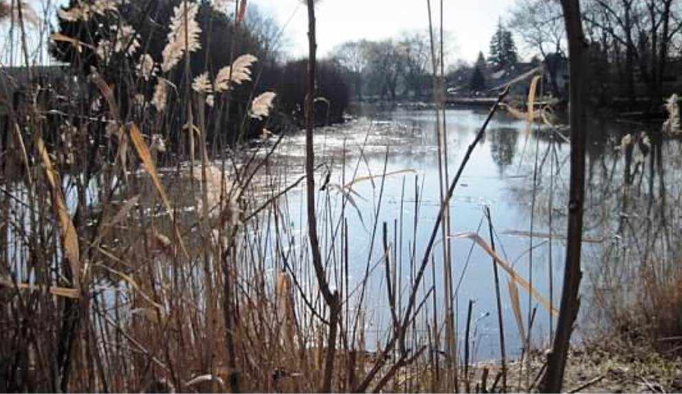 Although the last two warm and sunny days were perfect in every way, today was blustery and cold, so I was back in a hat, heavy coat and gloves. Since yesterday, I noticed that the lackluster landscape at the Park is very slowly coming to life. The trees are full of pale green buds but no leaves yet. The grass is even greening up. Those straw-colored reeds in the marshy area of the Creek have withstood the Winter and were waving wildly in the wind. I saw some splish-splashing going on in the Creek, though no geese or ducks were present, so I walked slowly down the embankment. I thought I might see some frogs or turtles nipping at the surface of the water, but all I saw were the rings remaining where they had come up for air, then quickly submerged again.