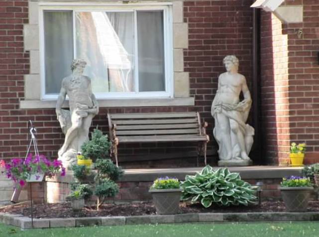 As I moseyed along the Boulevard, thinking about that robin and the statue, a bicyclist came by just then and did a shrill wolf whistle. I looked over, knowing full well it wasn’t directed at me, then had to stifle a giggle as the statuary above caught my eye. I see them every time I go down Emmons Boulevard, and, in the past, I’ve mentioned this pair that a homeowner stationed on opposite ends of the porch. As you can see, they are life-sized statues and one must take a second glance when you first come upon them.