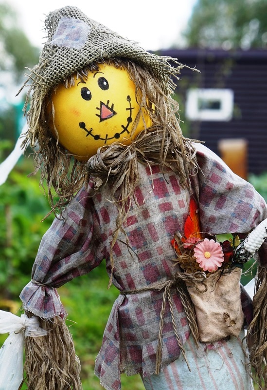 I’ve always been partial to those old scarecrows, whether they are used to keep your corn ears intact by keeping the crows at bay, or merely just for holiday décor, so I bought one yesterday. She’s a tall girl, cute as a button, with a checked blouse and denim pinafore and she sports pigtails which are actually straw-colored raffia. She looked cheerful and colorful – the perfect ambassador to stand by the door and say “Welcome all and Happy Fall!”