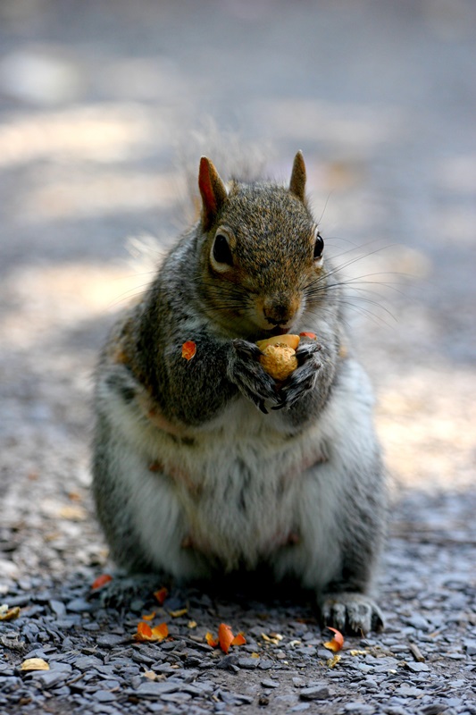 Once I arrived at the Park, finally, it was “my day” since I was not rebuffed by any squirrels, and instead one of my furry friends saw me taking the bag out of my pocket and came running over. He began first by sniffing my shoe, then climbed aboard and looked up at me to ask for peanuts – yes “asked” is how I would define sitting on his haunches and begging. So, who says squirrels aren’t trainable? I gave him some peanuts which I had squirrelled away in my pocket from yesterday. He took ‘em “to go” … well, that little escapade made my day.