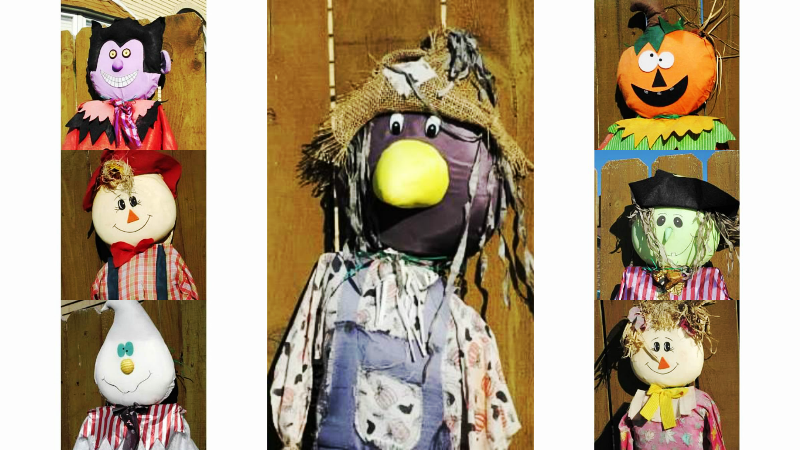 There is a large house on the corner just before you get to the footbridge.  Every year the homeowners adorn the tall wooden fence which runs along the property line with a series of seven different scarecrows.  They make me smile when I walk past them.  This motley crew has been “hanging out” since September and will remain there until the Christmas decorations go up.