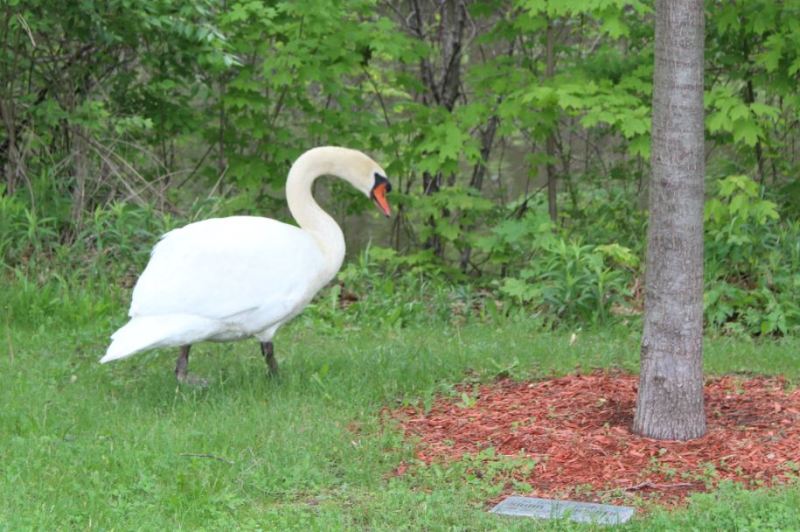 The swan meandered around Brian Skinner’s memorial tree, pecked at the mulch, then turned and went right back into the water. He could not have been on land for more than 90 seconds tops. He walked back down the embankment and next I saw him in the water, so I ran down to the cement landing to catch a clear view without any brush or reeds in the way.