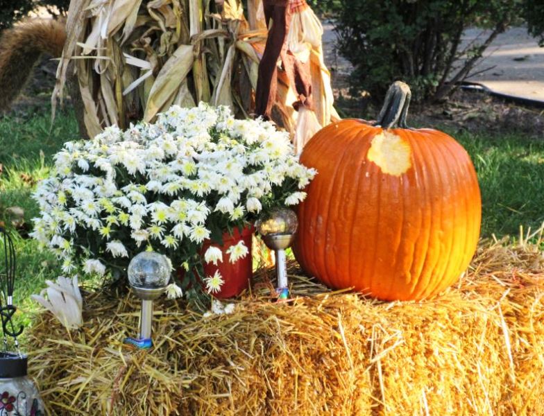 I stepped a bit further back so I could take a picture of the other pot of white mums which went flying when he jumped off the cornstalk onto the bale of hay where the pot was sitting. Nice going!