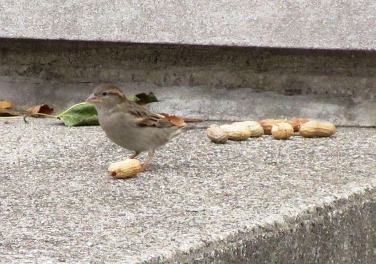 There is a gentle twitter as sparrows line up on the ledge, their tiny brown bodies angled to zoom down onto the porch. Surprisingly the sparrows, are in tune with this routine too. While I stood there shivering on the city sidewalk, trying to get some outside shots of the munch bunch, I saw a sparrow fly down from the ledge and grab a petite peanut in the shell from the porch. First he analyzed his capabilities versus this peanut in the shell …