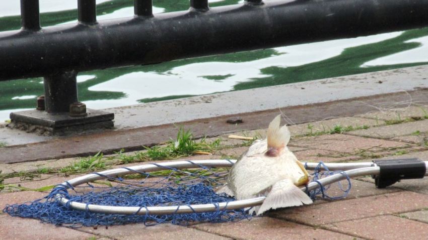 I could call this “Fake News” because I was there at 7:15 and it was an overcast day, then a big black cloud moved in overhead. I thought I’d go see what was happening at the River as it was the first coolish day in awhile. It was one of those odd-weather days where it was 30 degrees cooler than the day before. Right after I got there, the sky turned dark and I was mad I went, but it lightened up again and never rained. I was at two Riverfront parks that morning, Bishop Park and Dingell Park. I strolled along the boardwalk for both, but went to Council Point Park afterward to get in some more walking. I asked the fisherman what kind of fish and he said it was a Silver Bass and yes it is okay to eat the fish from the Detroit River. The water is very clear by the shoreline – you can see the rocks below and it’s a swift current there … no PFAS like the Huron River. When the Silver Bass are running in May and June, you cannot see the pier and boardwalk for fishermen. This big fish was missed by those fishermen back then – it lucked out … for a little while anyway. It was still twisting around a little when I went to take the photo.