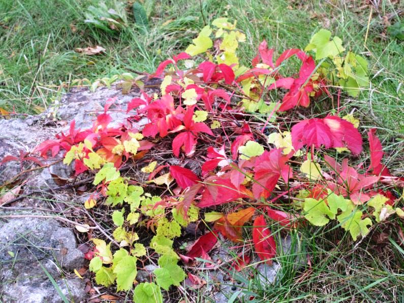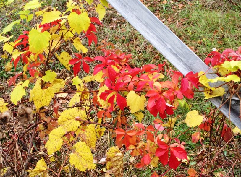 The colors are gorgeous!! The contrast is stark against the green and brown leaves. Hope those leaves stick around a bit longer for you to enjoy.