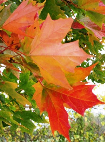 The colors are gorgeous!! The contrast is stark against the green and brown leaves. Hope those leaves stick around a bit longer for you to enjoy.