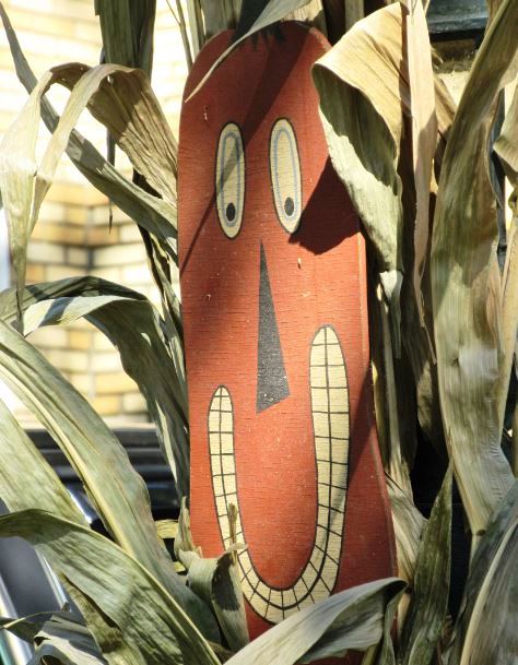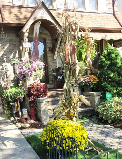 Sandra – their house is so fun to walk by. When school lets out at the school year end, he often has an old-fashioned desk which the top raises up and he puts a chalk board with the words “School’s Out!” nearby – he does a lot of clever things. I like the look of the corn husks for the harvest time.