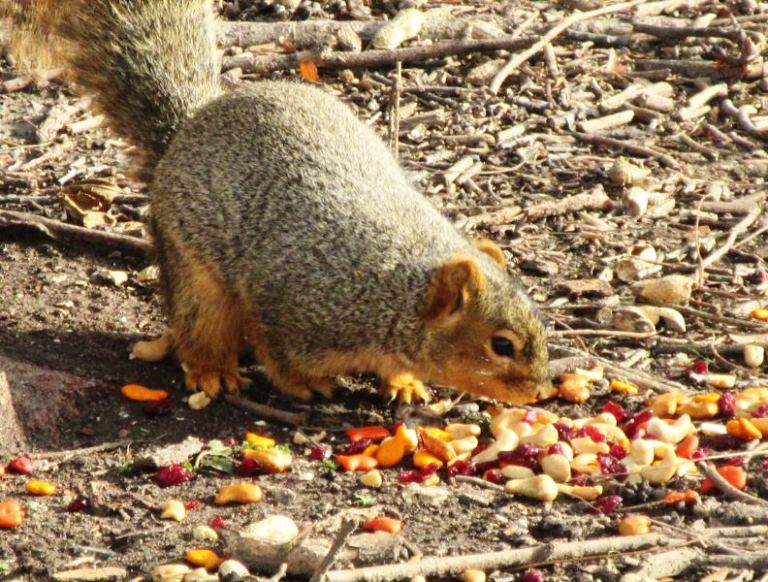 … until they were used to seeing the dish and what it was used for. Then later, once the snow began in earnest, I’d bring the larger, wooden platform feeder and fill it with peanuts and use this smaller feeder for seeds or suet. Satisfied, I had it all figured out, I even mentioned my plan to Arnie and Joe, two others who also have been doling out peanuts to the squirrels. As an incentive to visit the new feeder, I filled it with trail mix. Yes, it was healthy for them – I shared some of mine I’d just made up that morning.