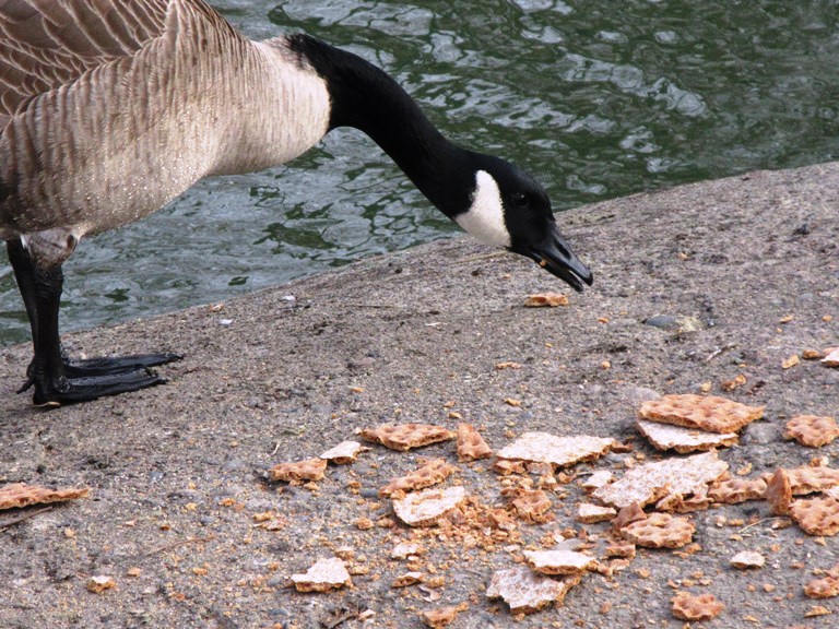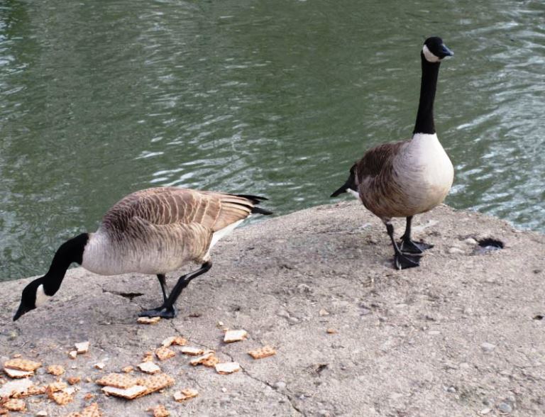 If you bring “critter food” you must bring enough for a crowd or risk hurt feelings. Many years ago, as a newbie to Council Point Park, I brought a bag of bread, after getting a buy-one-loaf-get-one-free deal at Meijer. I broke the loaf all up and figured I’d share it with the waterfowl. But no ducks were there that day, so I scattered the bag of bread for the Canada Geese, who waddled over and enjoyed it as a change from their regular grass diet. Back then I didn’t know bread was not good for waterfowl. So the gaggle of geese gulped down their bread, then their brethren, on the other side of the walking loop, were eager to get some treats of their own and they hurried over to see me. I showed them the empty wrapper and that didn’t go over well. They charged me and I ran like heck! I caught up with about a half-dozen women walkers and wormed my way into their cozy group and said “bear with me, those geese wanted more bread.” The ladies were cool with accepting me into their group, the geese lost track of me (whew) and I learned a valuable lesson that day.
