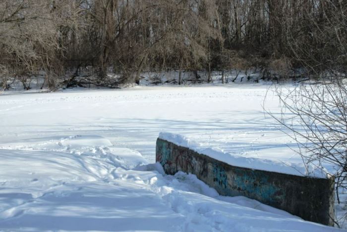 The cement ledge was snowy and the Creek was frozen over and piled high with snow.