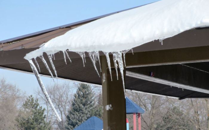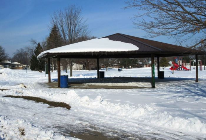The pathway area around the pavilion was similarly slick and icy, so I opted to just walk through the snow which I deemed safer. I stopped to get a shot of some icicles.