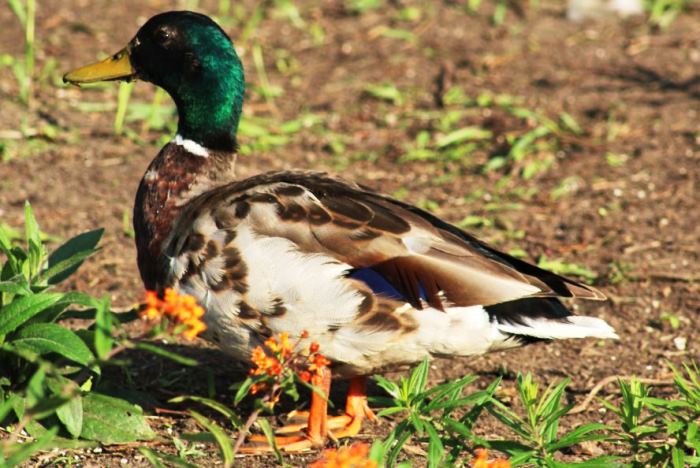 Actually this picture was taken in the Summer, in early July, the same day I took the photos of the ducks swimming around in that makeshift pond that will be in Monday’s post. The ducks and geese usually molt in June. At Council Point Park, once the geese start losing their large flight feathers, their goslings may not be able to fly yet as their wings are not grown yet, but they all paddle over to a big shoreline park as the geese can’t fly until the new flight feathers grow back and could be attacked by predators – they are safe in the water. The geese are gone all Summer from Council Point Park. As to the Mallards, their feathers grow back speckled brown (both male and female) and you cannot tell male from female – this is when they are in “eclipse phase”, then a month or so later they get their regular plumage in. I took a couple of interpretive cruises at the Metropark and one was in August and we passed a lot of ducks out on the water that all looked the exact same so the guide explained it to us. I would think they’d have their fall outfits by September.
