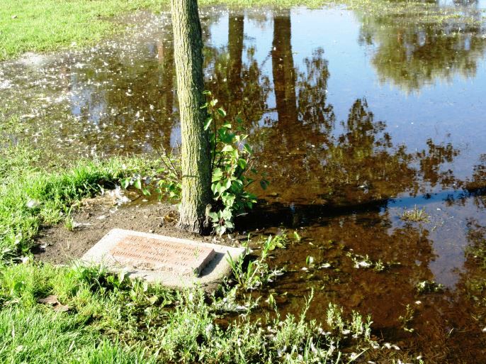 But despite the amenities, as you see below, the Mallards meandered over to the saturated lawn near the parking lot where they discovered this pond. You may think it is a gulley, but no, it is not – the lawn was so saturated and nowhere for the water to drain, that this pond formed.