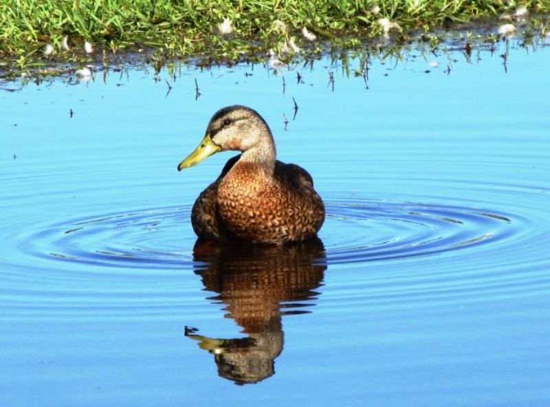 This Mallard seemed to test the depth of the water by waddling along with its bright-orange webbed feet on the grassy pond bottom.