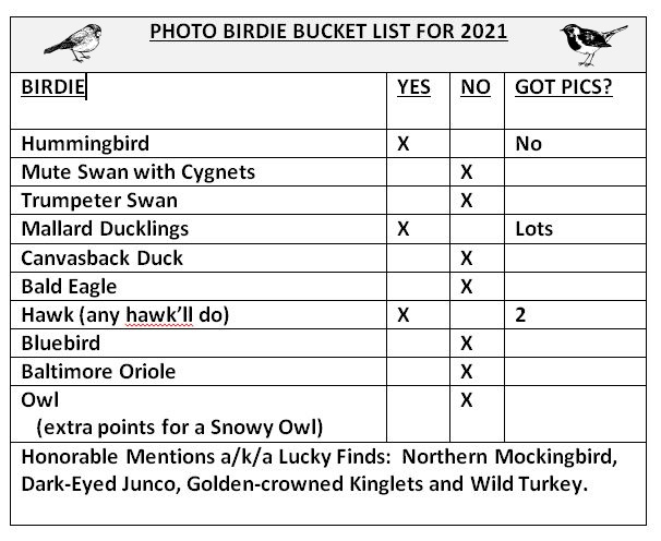 Besides participating in two “Bird Count” events in 2021, it’s time to revisit the perpetual “Birdie Bucket List” to see how I fared in 2021.