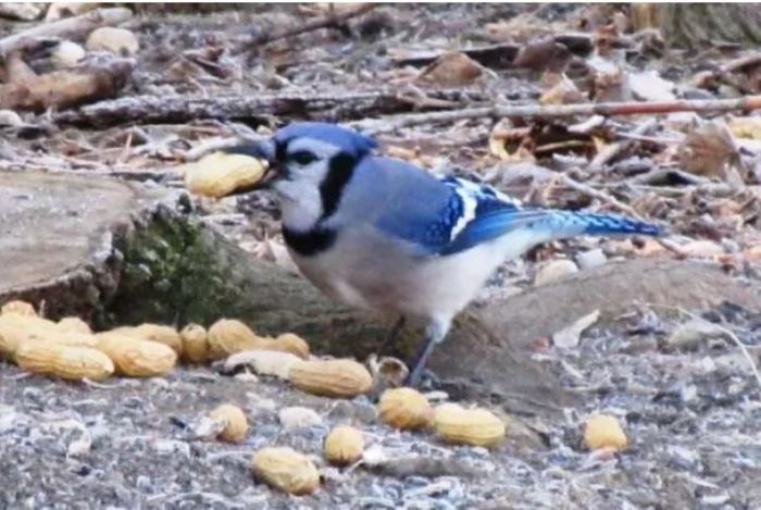 I love walking down the perimeter path as I hear the screech of a Blue Jay alerting its brethren that The Peanut Lady is on the premises. Sometimes the Jays or Cardinals follow me from tree to tree and, emboldened by these treats, quickly swoop down to snatch a peanut from the path. Maybe a Chickadee will alight on a nearby branch, waiting for me to move along so it can grab a sunflower seed (and no, I don’t take that personally).