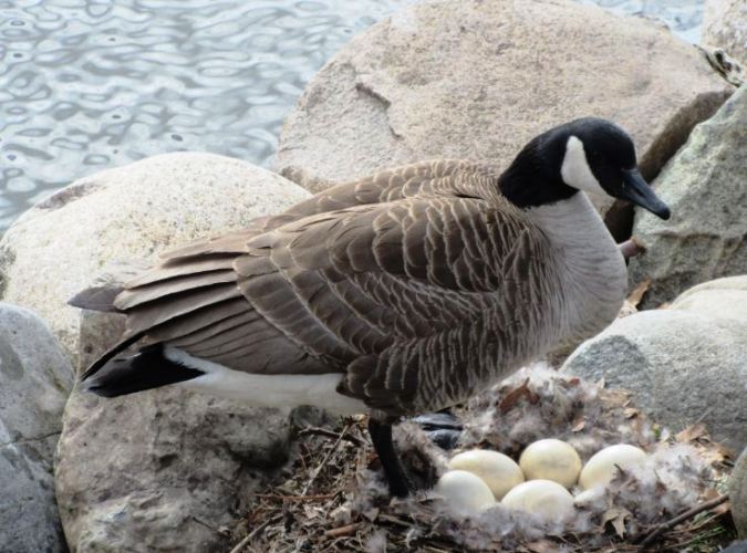 Easter Sunday was very chilly and windy. Unbelievably I was the only one walking at this popular venue. I decided to check on Mama Goose and strolled over to her rocky perch. Imagine my surprise, not to mention my delight, to see Mama off the nest, stretching her legs and having a drink of water. She didn’t notice me as I stood under the covered bridge and evidently Papa Goose was not around.