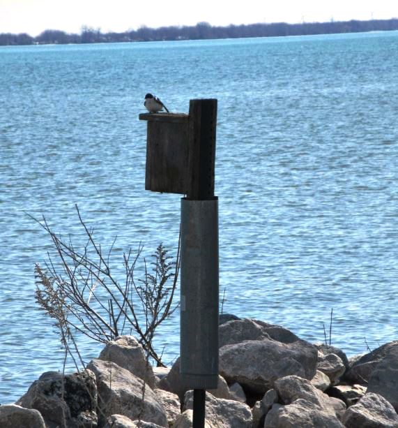 A Swallow scoped out future housing. Should I tell him/her that volunteers built and erected many nesting boxes along Cove Point to entice BLUEBIRDS? Swallows prefer nests in rafters, like in the covered bridge at Heritage Park, or below wooden outlooks. He alighted just long enough for me to snap its picture, then it left again, so perhaps it read my mind.
