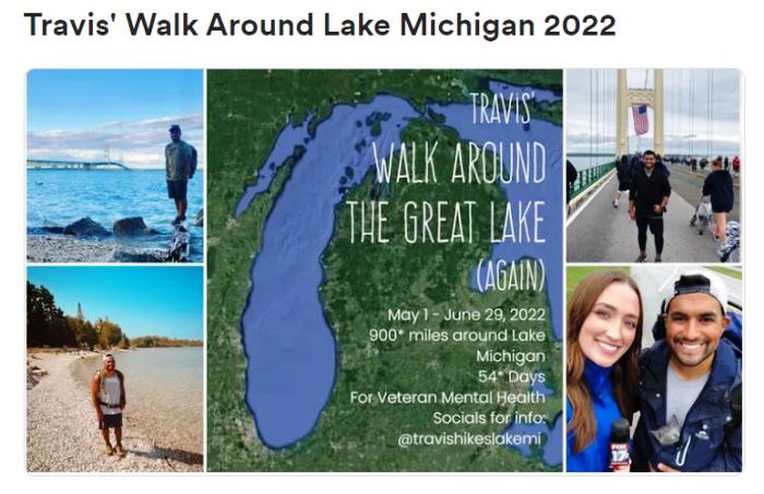 Today, I want to tell you about Travis Snyder, a 38-year-old Marine veteran who lives in Holland, Michigan. This is the fourth year that Travis Snyder has trekked around Lake Michigan to raise money and awareness about veteran suicide, an effort he began after suffering from anxiety and depression after a tour in Afghanistan and then losing one of his military friends.
