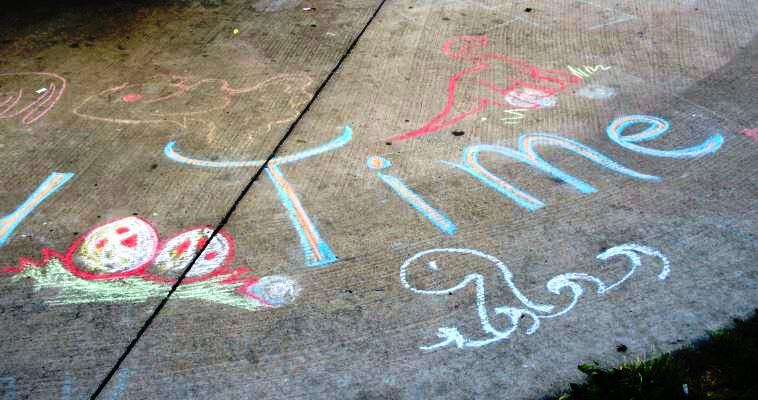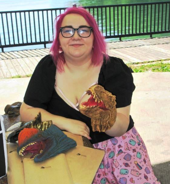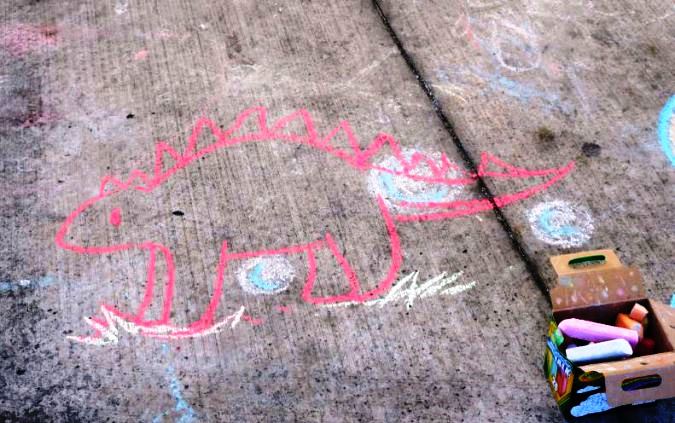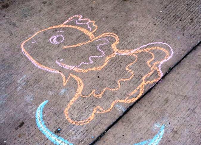 The following Friday found me once again strolling the boardwalk after walking four miles at Council Point Park. Alice and Madison were ready for their encore performances, as reader and artist respectively, but this Storytime featured dinosaurs. Chalk art lovers will like these fierce dinosaurs and dinosaur eggs. Madison is posing with dino hand puppets.