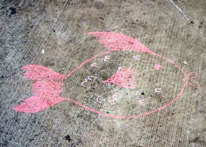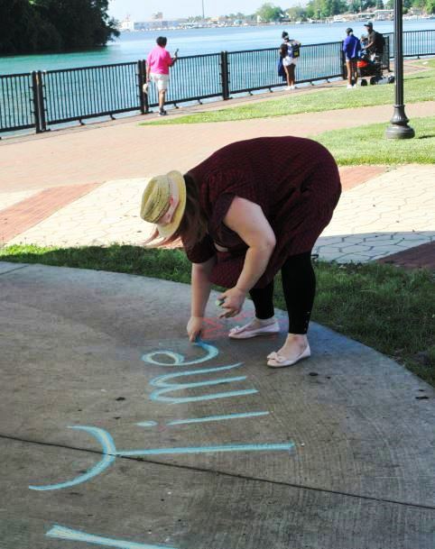 I learned that the Ecorse Public Library was conducting its own Storytime at 10:00 a.m. under the pavilion. I met the four library staff members: Alice, Madison, Katie and Oliver and, while I regaled them with my memories of Miss Montie and her Storytime sessions, Madison, who is also an artist, was busy creating chalk art drawings to match the fish theme for that day’s reading.