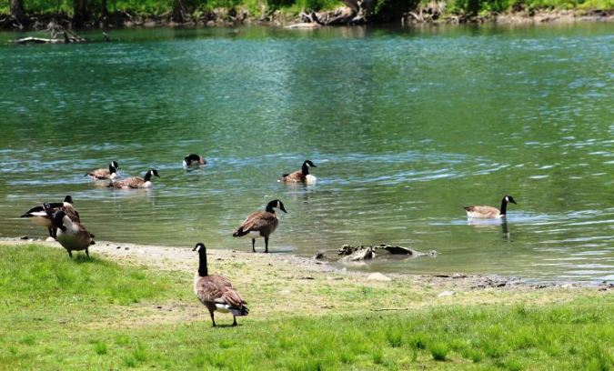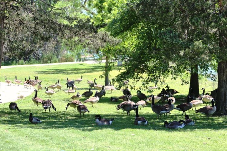 That is because Summertime is molting season for these geese, so they are congregating en masse in park venues with large bodies of water, in the event of land predators lurking about.