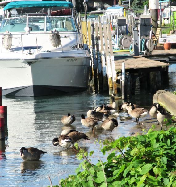 In the Summer months, I like slipping down to Dingell Park to watch the freighters and stroll the long boardwalk. That boardwalk eventually dead-ends at a secluded and fenced-in area where boats fuel up. I found a group of geese, no doubt some refugees from Council Point Park. They were busy picking at their feathers.