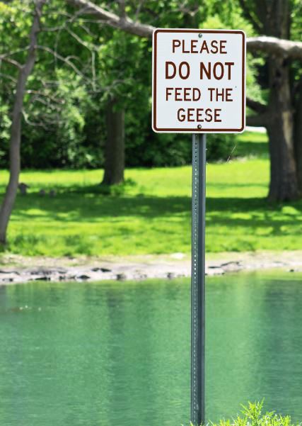 Tossing a few peanuts to the begging squirrels is A-OK, but tossing food to the geese is a no-no in this park. There are signs everywhere, like here at the canal.