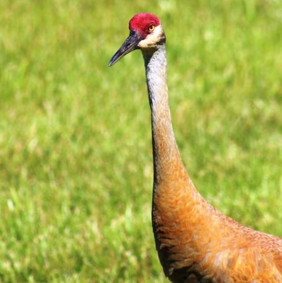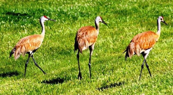 … when I heard some very loud squawking noises overhead. My head swiveled upward and soon thereafter I watched three large birds descend onto the grassy field. I recognized them immediately as Sandhill Cranes, birds I’ve only seen in photos, never up close and personal. They weren’t bothered by my presence in the least, so I took a slew of shots and blogged about them in two posts.