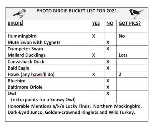 This was last year’s list of hoped-for bird sightings as 2021 came to a close. As the year progressed, I began ticking off several birds on the List: