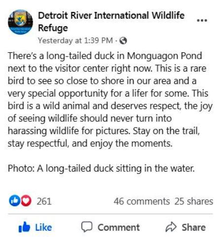 That discovery began the evening of Saturday, December 10th when I was perusing my Facebook feed which is flooded with posts by the parks and nature venues which I frequent. The Detroit River International Wildlife Refuge (“DRIWF”) in Trenton had a Facebook post about a unique duck visitor to the pond.